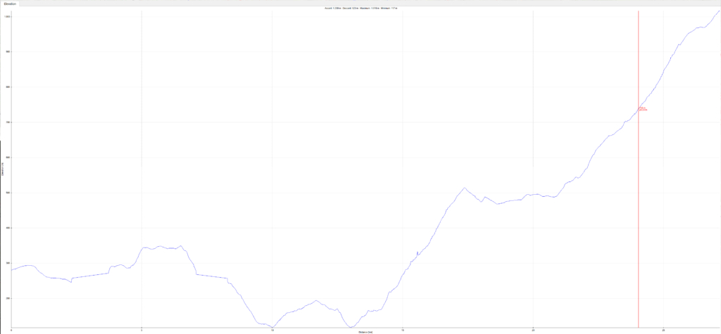Po ravnih 3 km pridemo do Podgorja, kjer iz izhodišča 490 m n.m. začnemo 6 km vzpon na 1.016 m visok vrh Slavnika. Prve 3 km vzpona, do skalne police, pridobimo le 250 v.m. Vzpon nas počasi prazni do 25. km, kjer pridemo na požarno preseko. V predzadnjem kilometru in pol se tako s težavo dvignemo za 200 v.m. po zelo slabem šodru. Da je mera polna se strmina postavi precej pokonci, tako da do vrha Slavnika izpraznimo vse :).