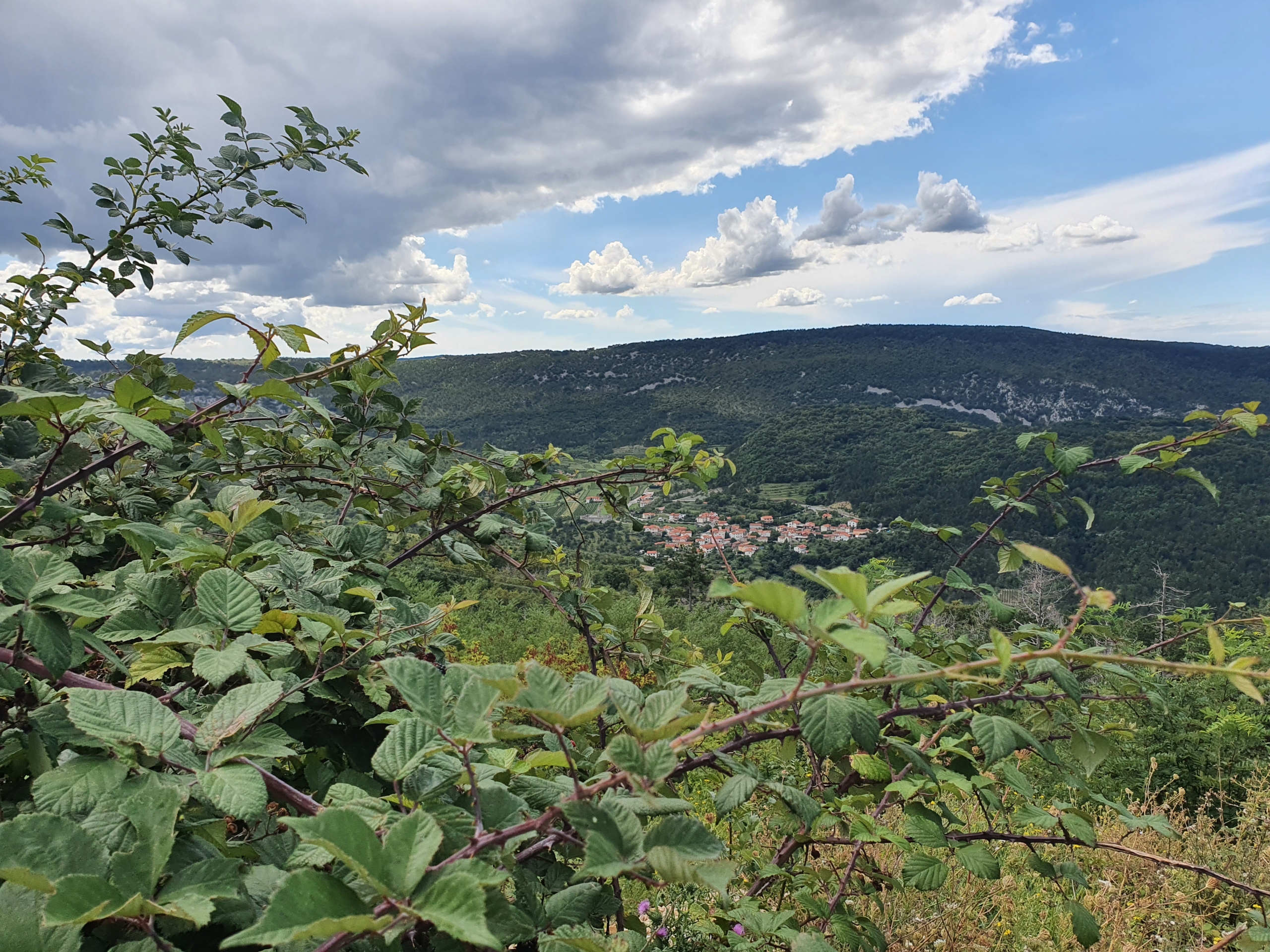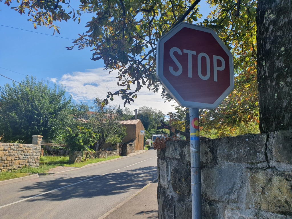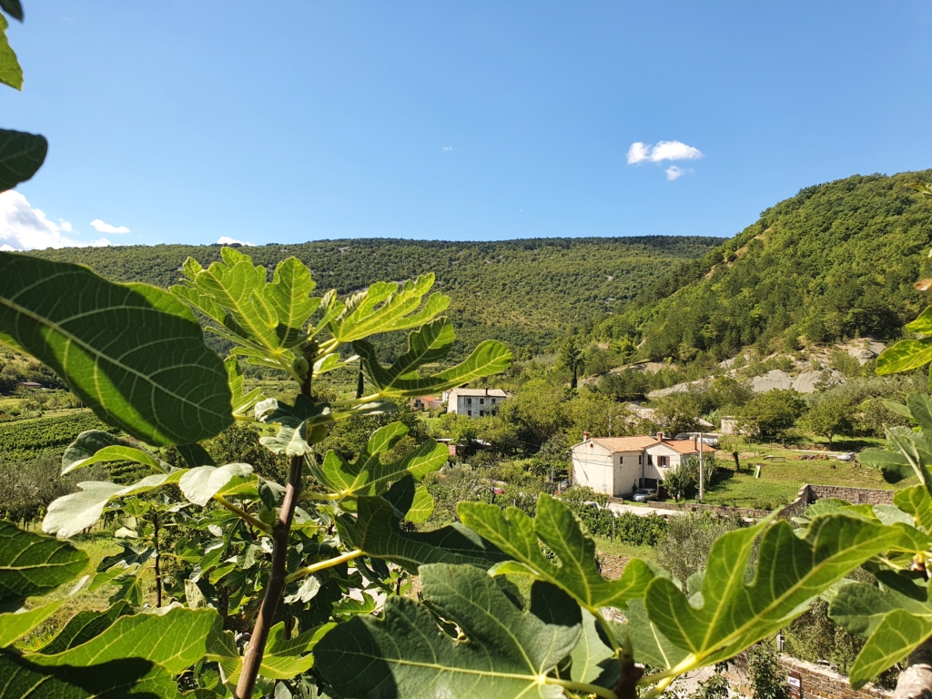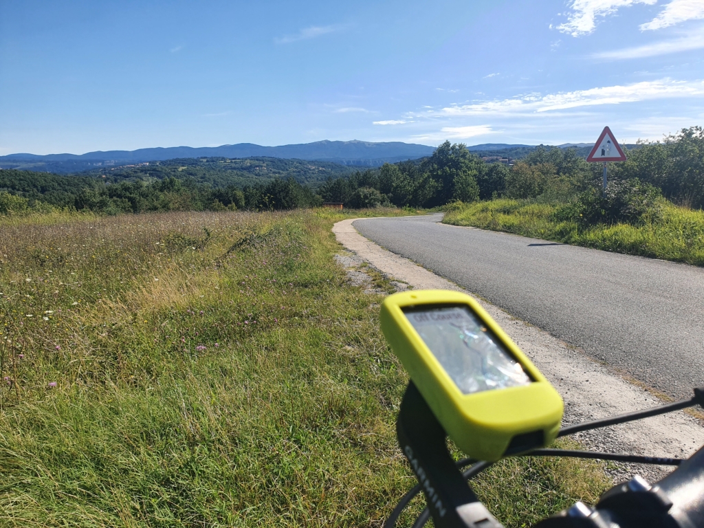 Prvih 6 km se vozim večinoma navzdol, po lokalnih asfaltnih cestah, z redkimi, blagimi klanci in uživam v razgledu po okoliških gričih, zasajenih s trtami in nasadi oljk. V daljavi že vidim Slavnik, ki ga z lahkoto prepoznam že na daleč, po velikem stolpu sredi vrha. Klima je prijetna in veter me hladi v dopoldanskem soncu.