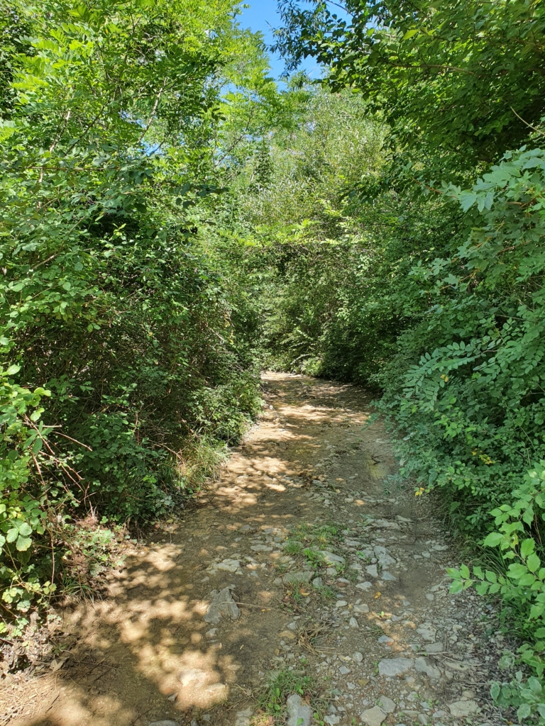 Na 7. kilometru prvič zapeljem z asfalta, levo na kolovoz, ki je del evropske peš poti. Po njej se iz severo-zahodne strani po flišnem hrbtu, skozi gozd, blago spuščam proti Kubedu. Na spustu skozi zeleni koridor me prijetno hladi, pogled na uro kaže, da je prijetnih 26°C. Uživam, ker končo vozim po naravni podlagi. Utrjena zemlja in drobni kamenčki so pesem za moja ušesa. 2 km turne poti popestri spust čez flišni hrbet, redki naravno tlakovani skalni odseki in zanimiv zaključek čez plasti lomljene skalne podlage, tik pred vstopom v Kubed.