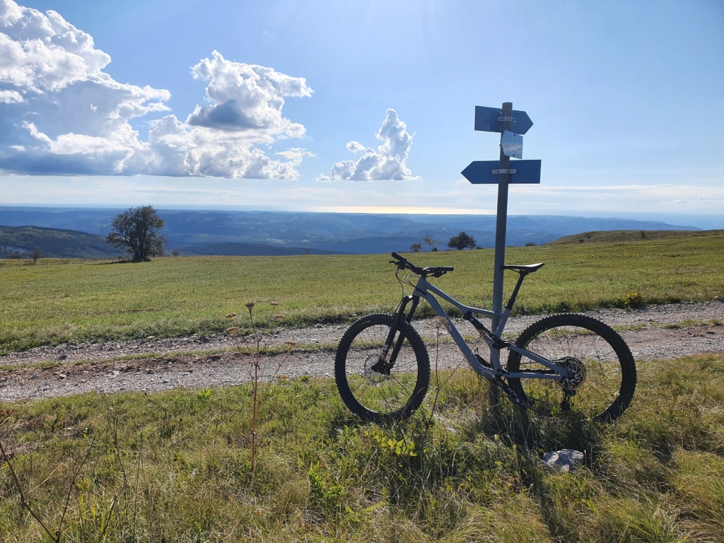 Po skoraj 30 min skakanja s kolesa in sočnega preklinjanja v klanec, končno dosežem zgornji del hriba. Vesel sem, da se pot zravna, podlaga nekoliko utrdi in odpre se mi čudovit pogled na Koprski zaliv in severno Istro. Oddahnem si in se razgledam. Veter me prijetno hladi in globoko vdihnem zrak. Vonj po soli in suhi travi mi dajeta energijo, da počasi nadaljujem pot proti vrhu. Nevihtni oblaki so se premaknili južneje in temperatura je prijetnih 26°C.